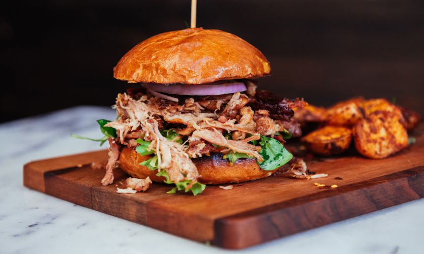 Pulled lamb burger – with rocket, cumin onions, tomato, pesto