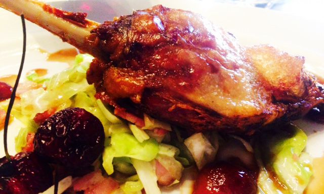- slow cooked duck leg, cabbage and bacon, late summer cherries
