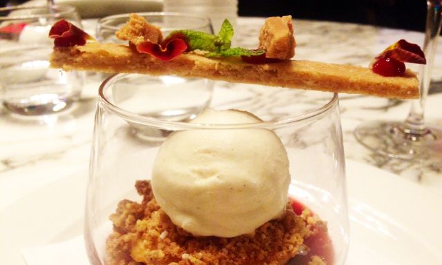 - roasted peaches, almond crumb, vanilla ice cream, spiced caramel shortbread
